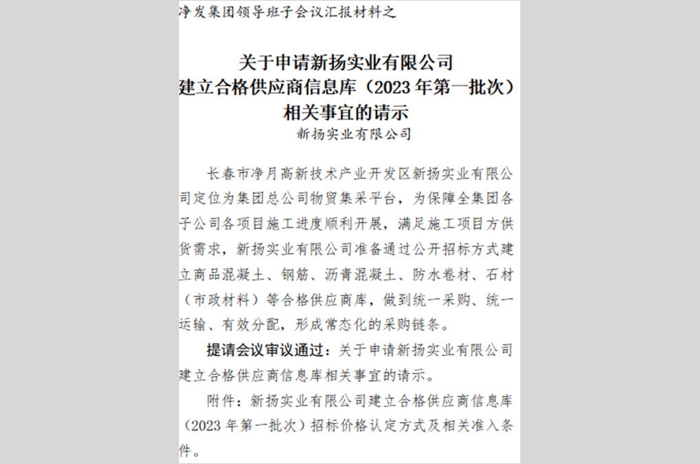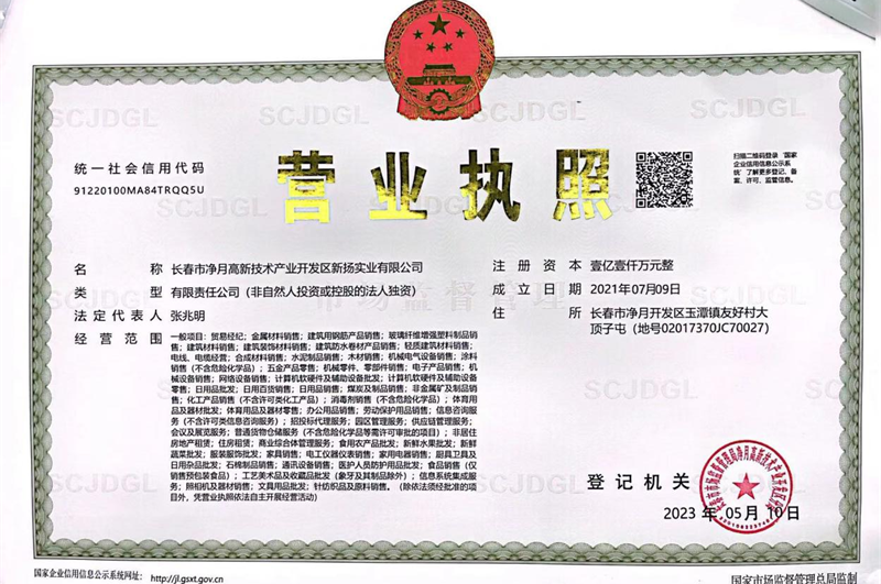 吉林省净发供应链有限责任公司(原长春市净月高新技术产业开发区新扬实业有限公司)成立于2021年7月9日,注册资本金为1.1亿元,是吉林省净发创新投资集团有限公司旗下的二级子公司,为集团集采平台。公司坚持贯彻新发展理念,牢牢把握“谋经营、抓落实、强管理”的工作总基调,紧跟净月区高质量发展需要,推动企业不断取得新成效、实现新突破,为区内重点基础设施建设项目提供材料供应保障。