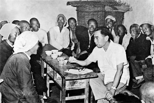 座谈会上,社员来了很多。但大家都低着头坐着,都不吱声。周恩来见老百姓心里有顾虑,有怕“官”畏言的心理,便转回身指着墙上挂着的毛泽东和他本人的画像风趣地说:“我叫周恩来,就是墙上的那个人,你们看像不像?这次来,就是要听听你们的心里话。你们有什么话只管说,有问题只管提,说错了也不要紧。”