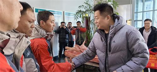 基地负责人引领慰问组参观了基地职工食堂和宿舍。杜峥平董事长详细了解了职工的生活、身体情况及春节值班安排,对一线职工“舍小家为大家”的奉献精神给予高度肯定。特别强调指出,集团是大家坚实的后盾,要求各级工会组织始终把解决好职工最关心、最直接的现实利益问题作为出发点和落脚点,当好职工“暖心人”,同时希望大家在工作中要提高安全意识,以更强的责任心和使命感,共同把净月区建设得更加清洁美丽。最后,杜峥平董事长代表集团为大家送上了猪肉、牛肉、米、面、油、调料、棉服等生活用品。
