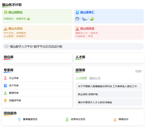 “福山数字人才平台”。福州软件园以产业数字化理念为导向,融合信息化技术自主开发了“福山数字人才平台”,于今年建成使用,由产业服务公司负责具体开发运营,以数字化、智能化、可视化为总体思路服务于人才工作,集中展示信息、宣传成果、搭建桥梁,全面助力企业找人才、找项目、找专家,人才找工作、找活动、找政策。设置“一计划四库一超市”,打造集人才公共服务、人才供需匹配、人力资源服务、人才发展可视等功能于一体的综合性人才服务线上平台。