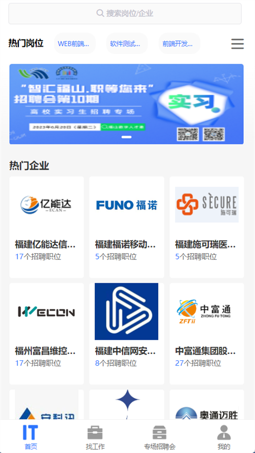 “福山优才计划”设“福山招聘会”“福山大讲坛”“福山赛事汇”“福山精英荟”四个模块。“福山招聘会”实时发布专场招聘会、空中双选会、企业宣讲会等活动信息,人才云宣讲、企业宣传、职位推介等直播信息,并按照时间、状态进行有效划分,便于检索查看。“福山大讲坛”重点围绕学术交流、政策解读、企业管理、技能提升四个方面,发布课程预告及成果展示。“福山赛事汇”专题发布软件园三大赛事的相关信息。“福山精英荟”则是为校友会、行业协会、院士工作站等高层次人才搭建畅通桥梁。